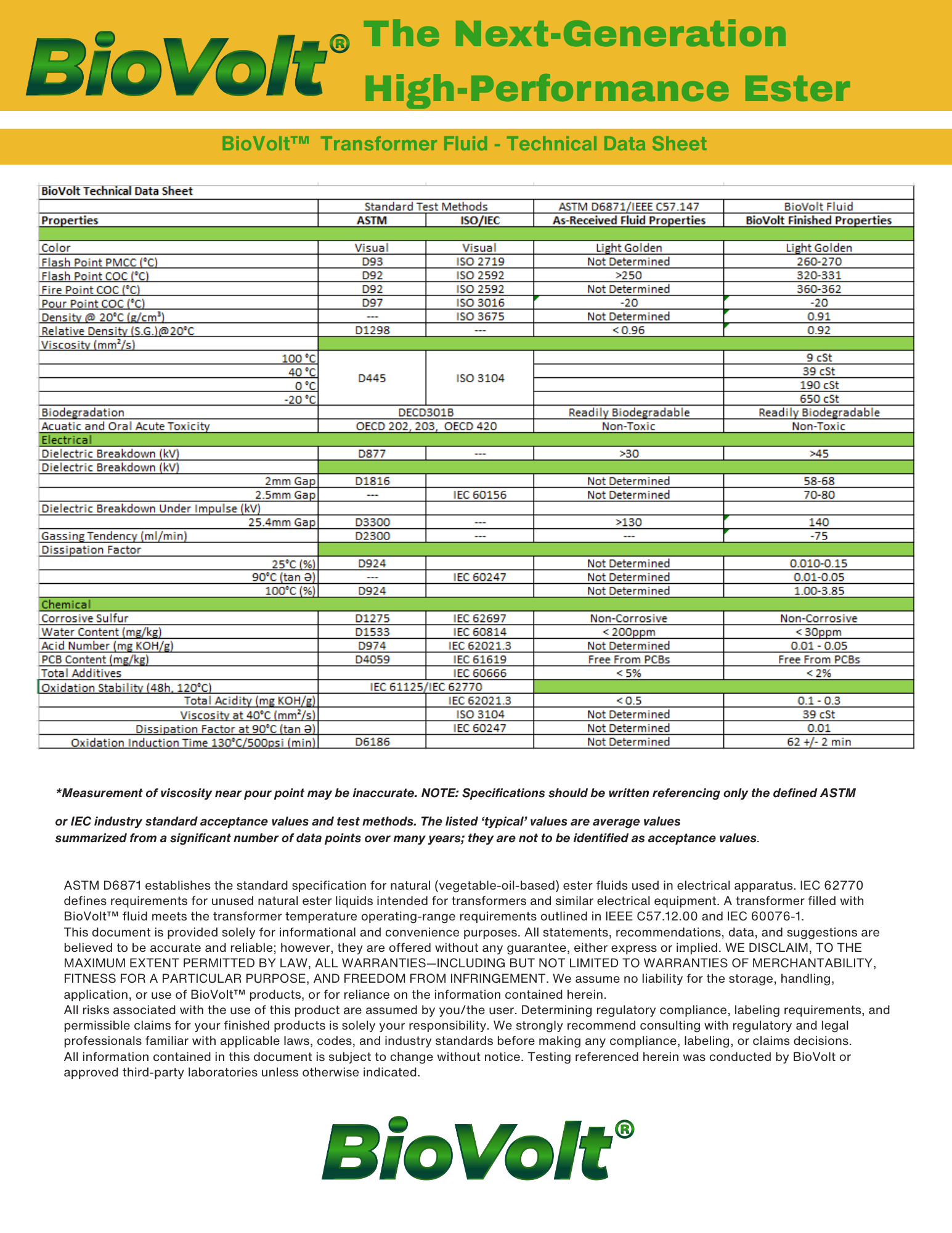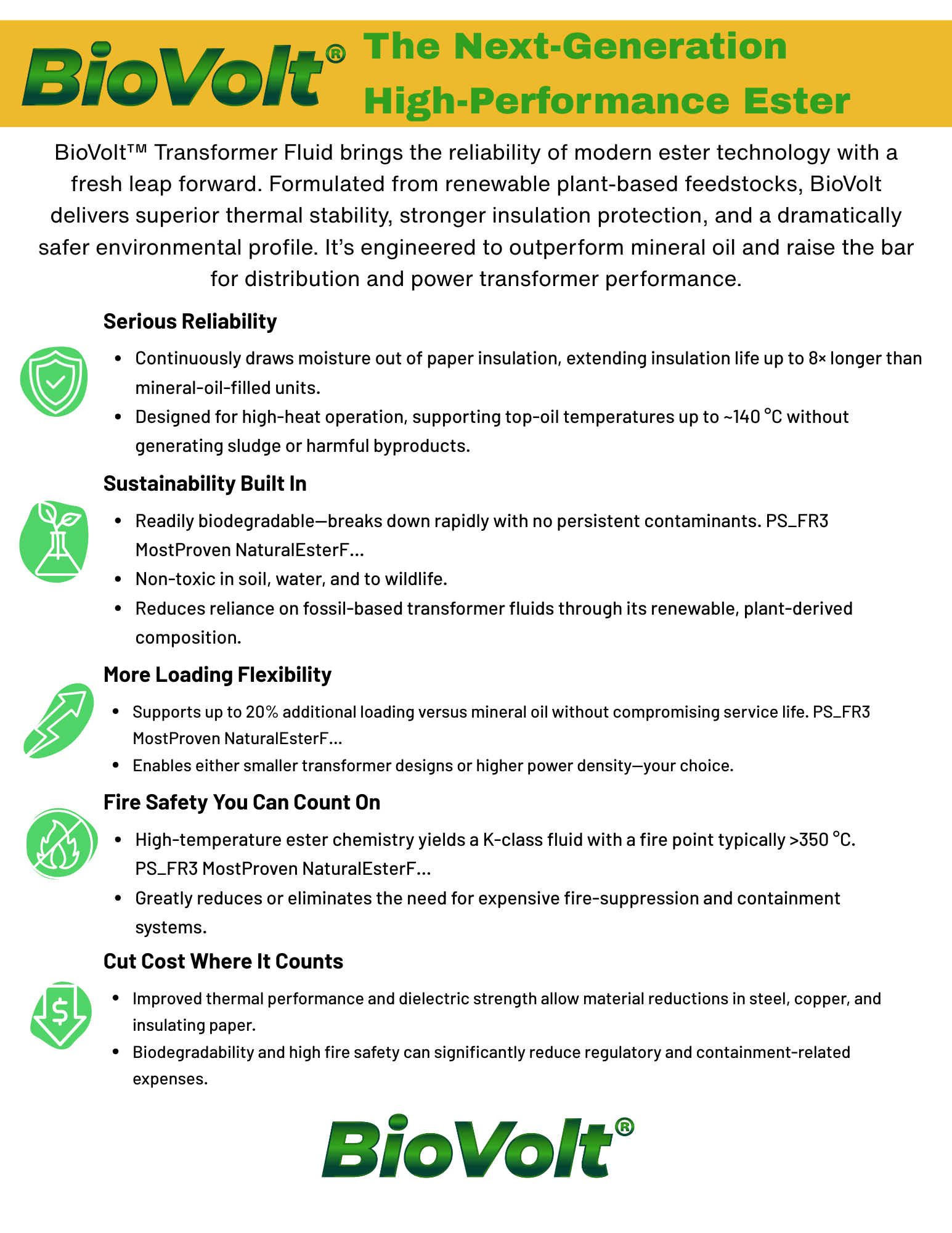 BioVolt™ offers excellent moisture tolerance, naturally extends the life of cellulose insulation, and provides a significantly higher flash and fire point compared to traditional transformer fluids. With its clean chemistry, high dielectric strength, and strong oxidative resilience, BioVolt™ enables safer, greener, and more efficient transformer operation across a wide range of industrial, commercial, and utility environments.